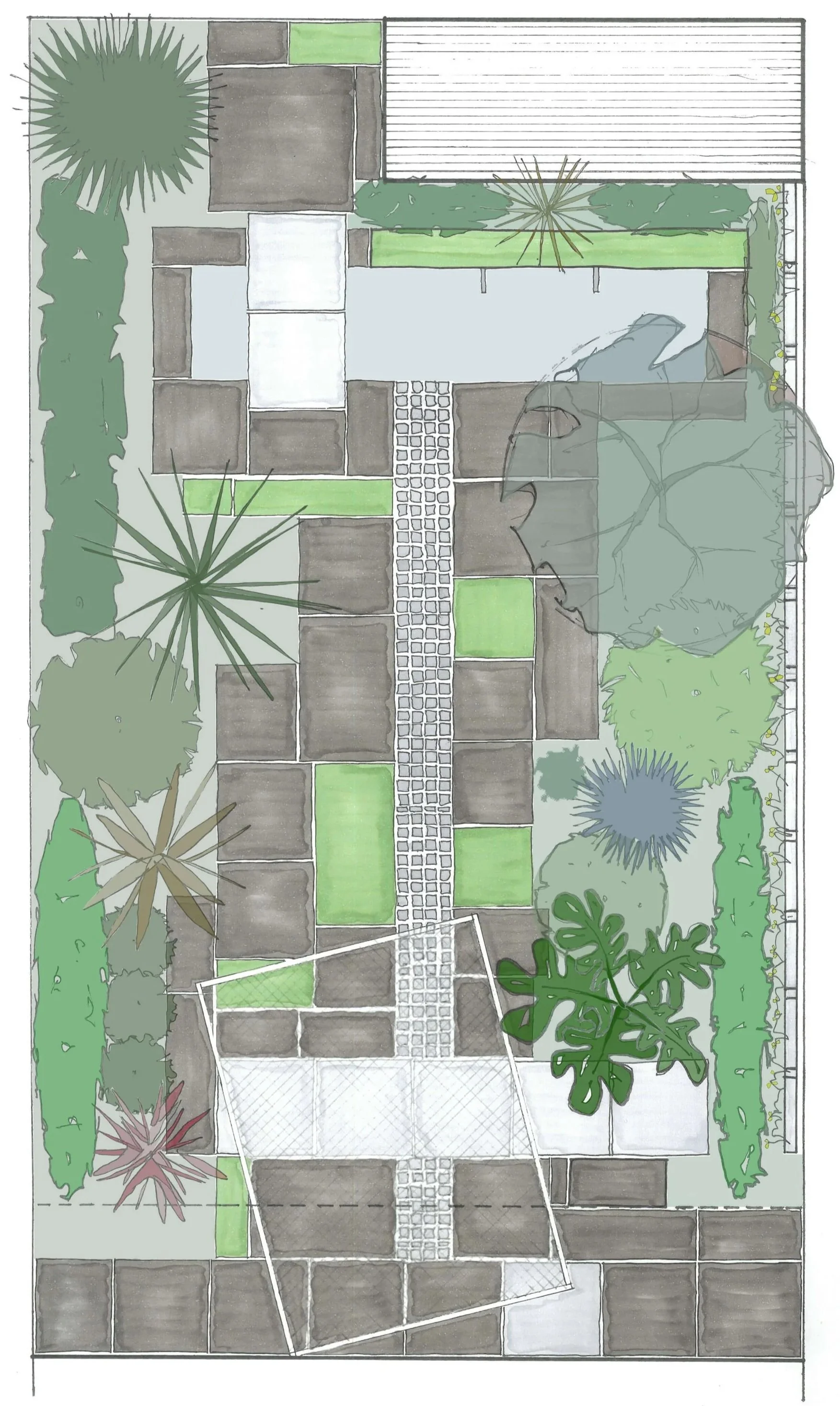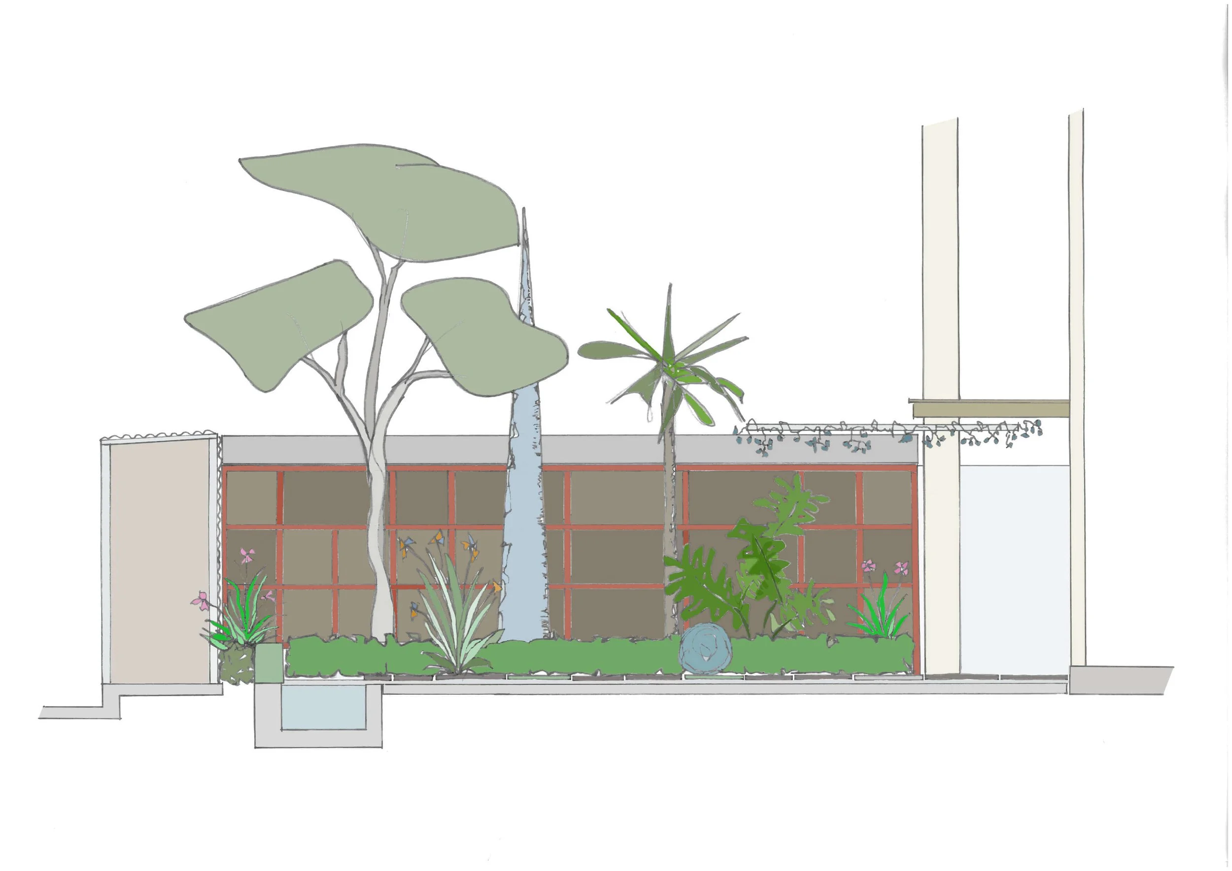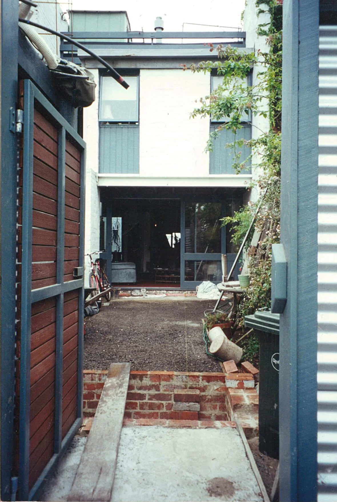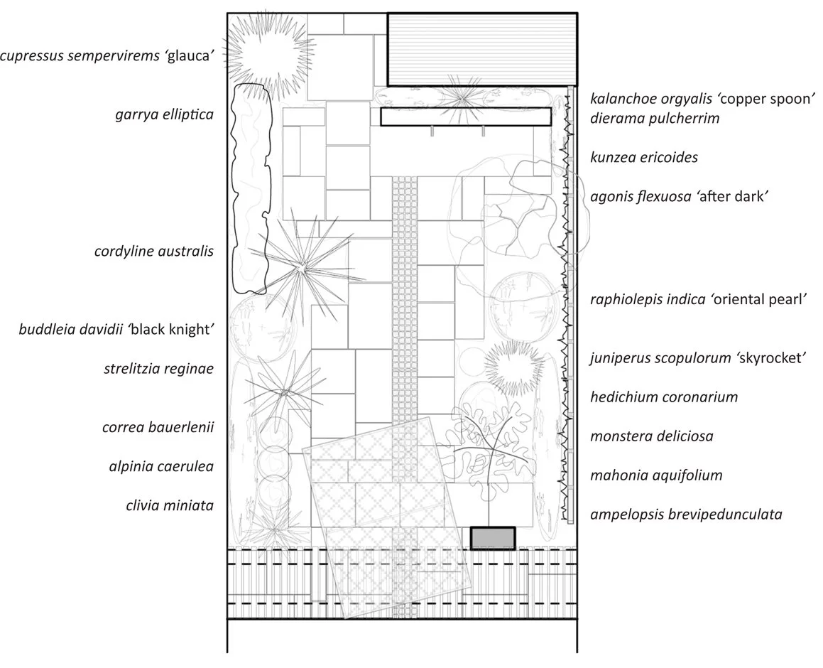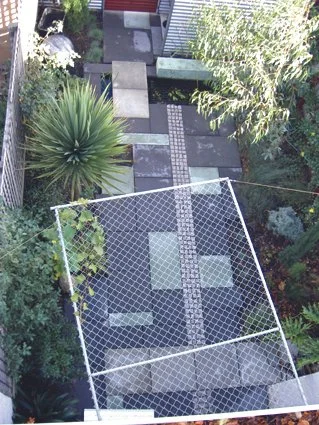 George’s circa 1970’s terrace house lacked an appropriate courtyard garden. Assembled with salvaged and 2nd hand materials, this small modernist composition plays muted greens and greys off against a deep red, large format trellis and matching gate. A band of granite cobbles lead the eye to the pond at the end of the courtyard and a suspended re-purposed chain mesh gate serves as an arbor for the pepper vine growing overhead.