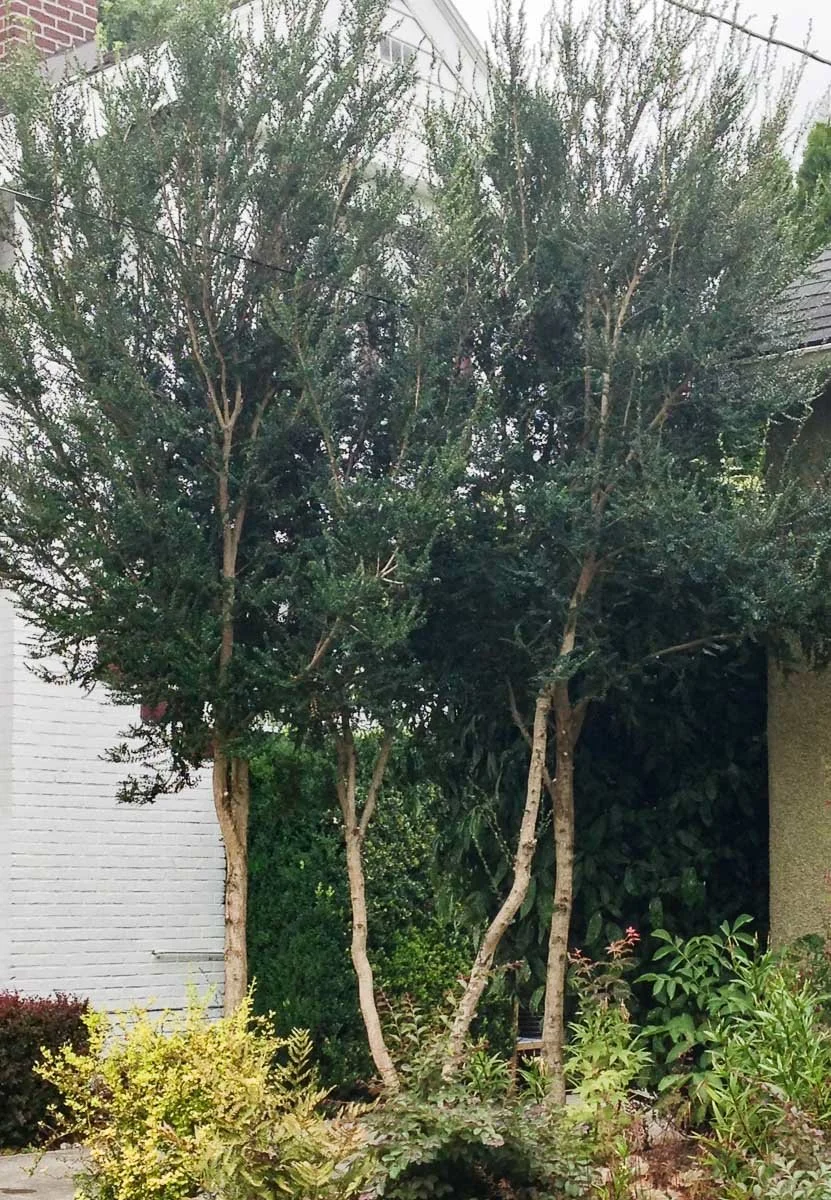 The largely exotic planting retained two of the fruit trees, added lavender, rosemary, roses, clematis, various perennials and other evergreen trees and shrubs.