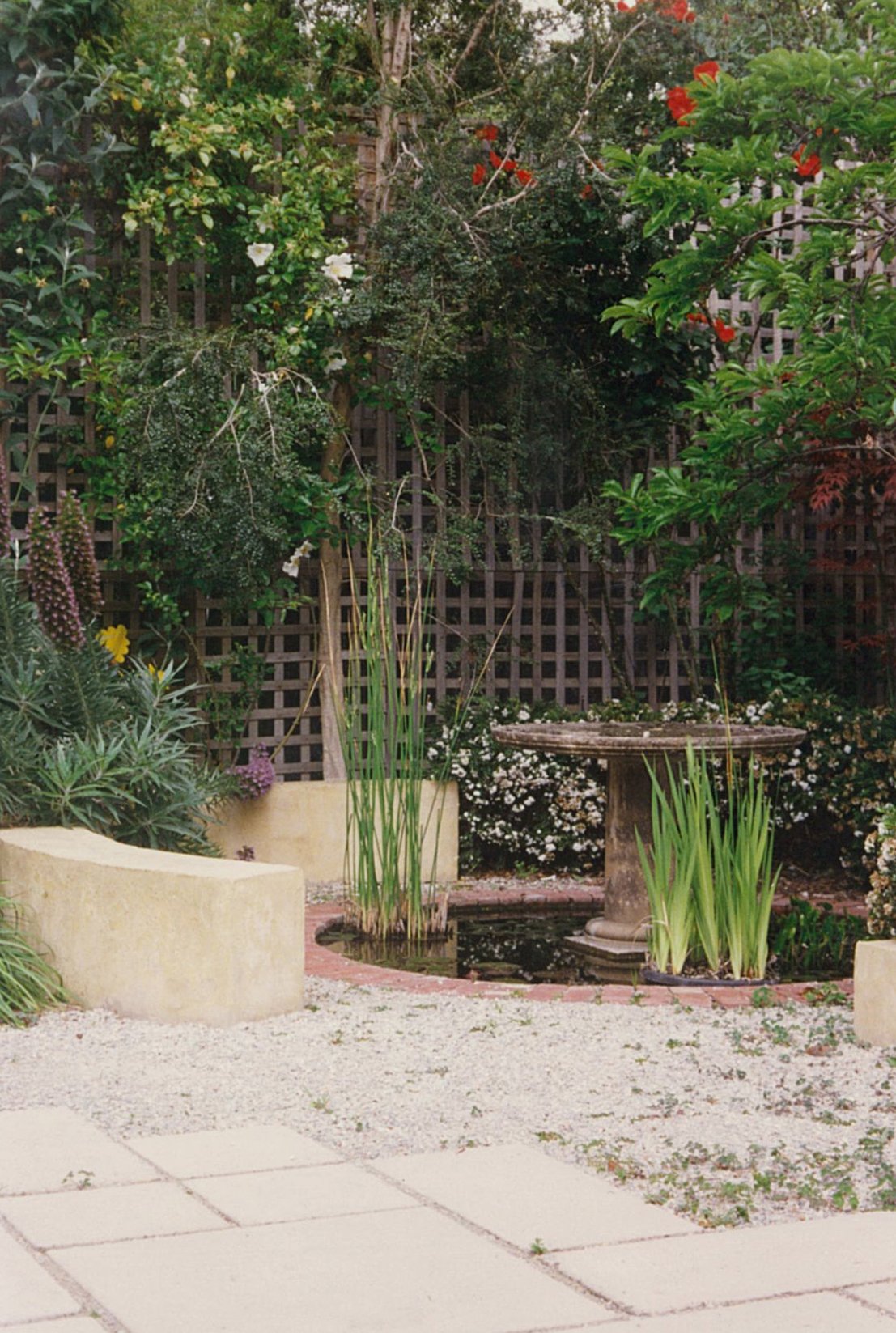 This almost perfectly square garden was initially forbidding. Three-metre-high lattice screens enclosed a site that was fairly barren but for a handful of residual fruit trees.