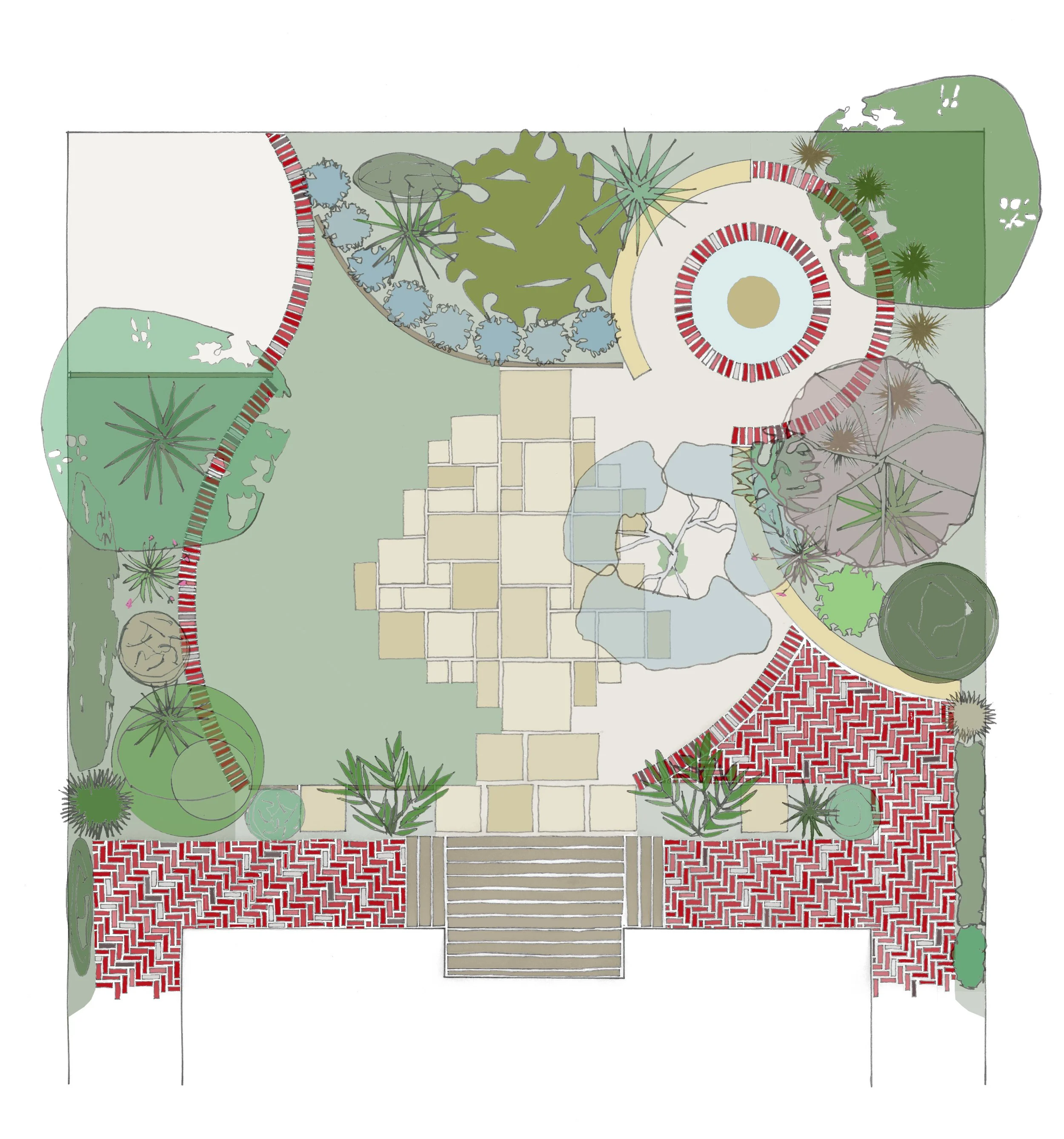 The design refocused views from the garden’s edges to its centre: the fences are now screened with dense planting while a series of curved forms frame internal spaces within the larger square. Existing red brick was reused with precast concrete for the paving and low rendered walls added as seating edges that also retain garden beds.