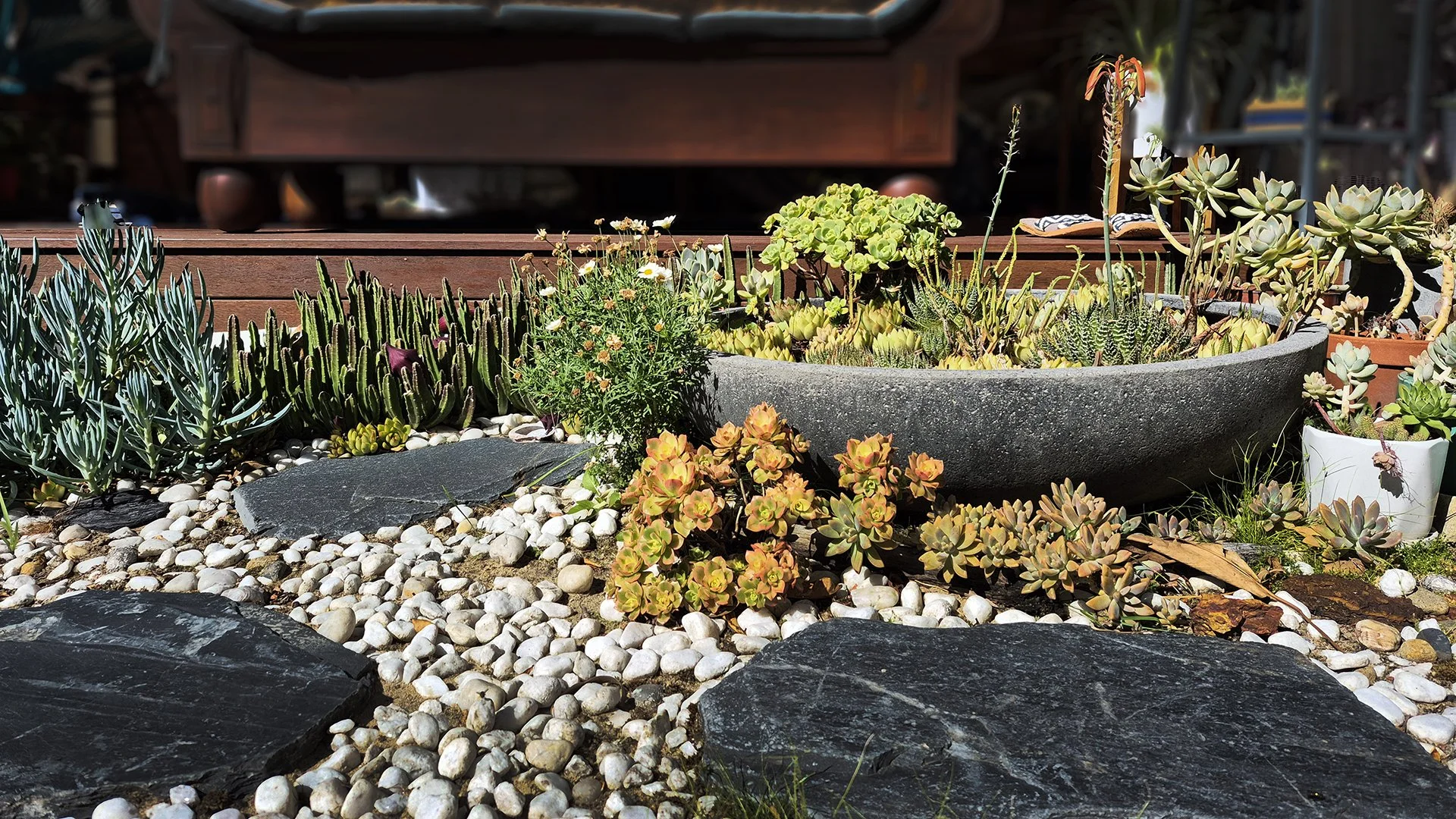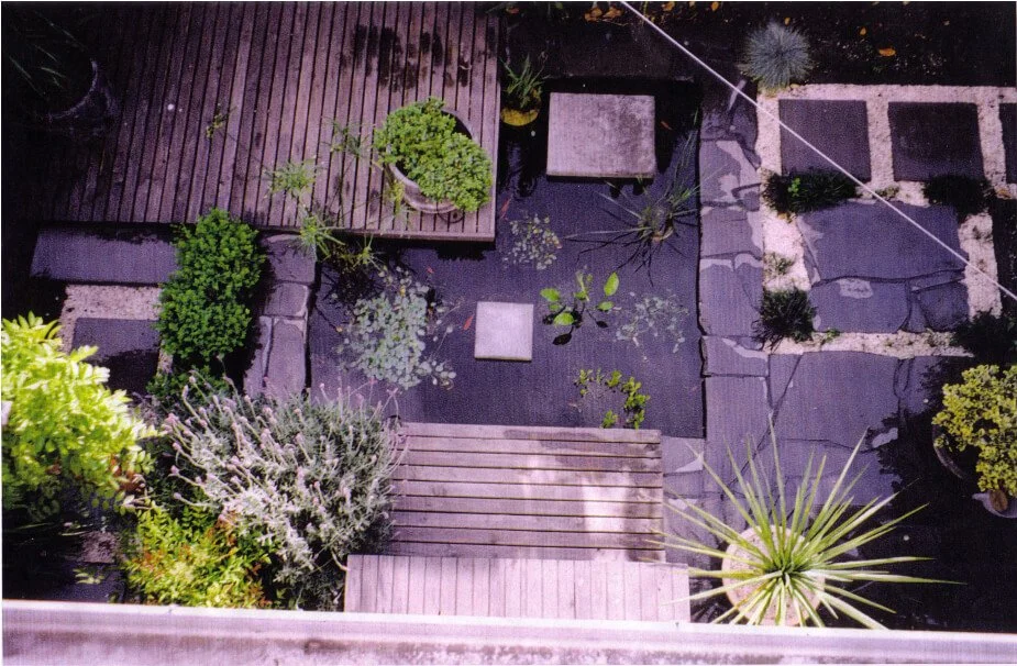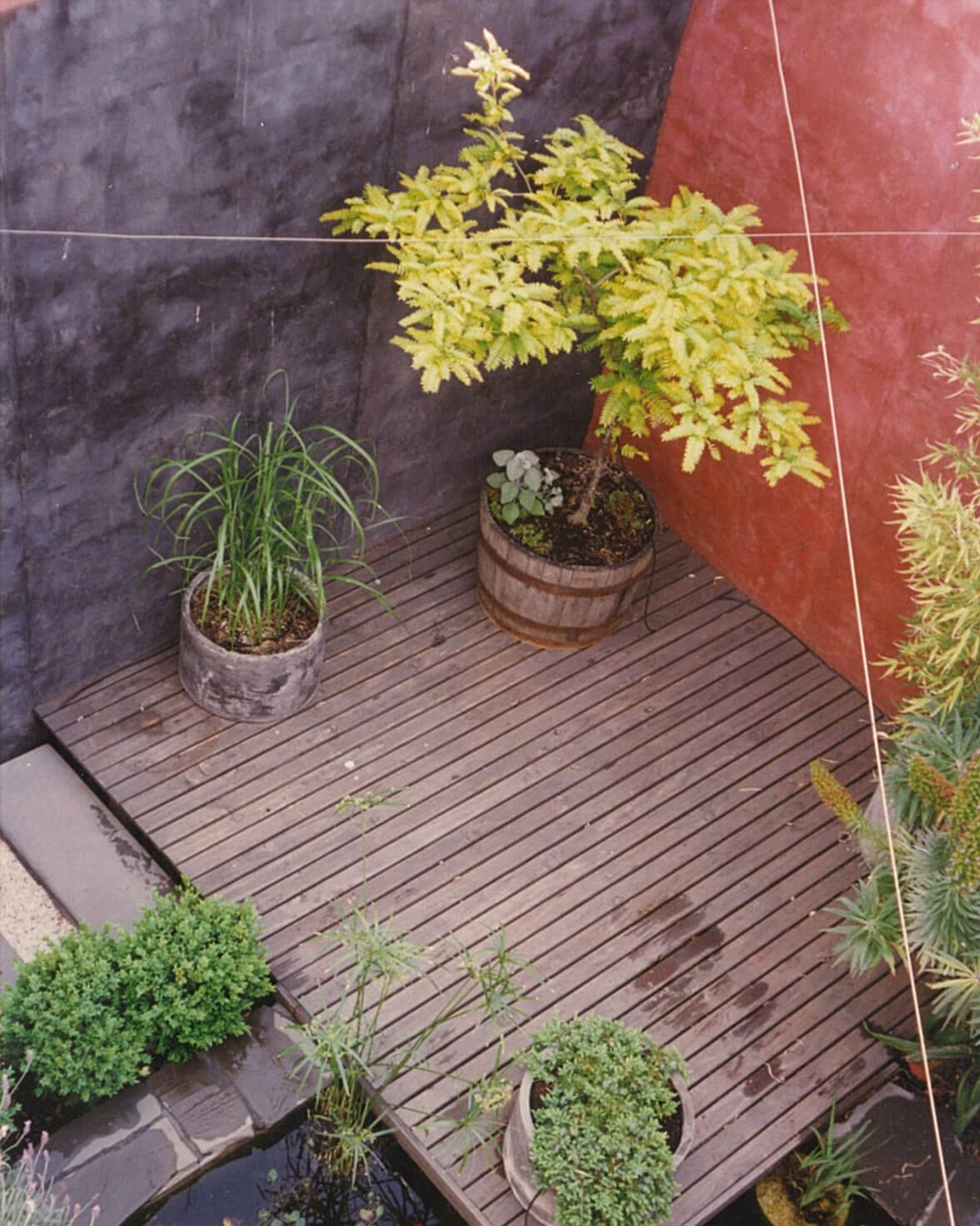 Crossing the pond to reach the deck lends depth to the small space while the earthy black and red colour palette, used in the rendered walls and paving, and the relatively spare planting lend a Japanese feel to the landscape.
