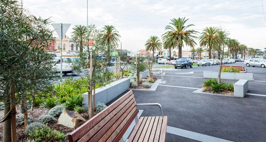 Andrew Brophy at Urban Initiatives designed a suite of changes to the Mordialloc retail strip in 2013. Street plazas with distinctive planting, granite seating walls, new pavements and furniture capitalised on existing wider footpath areas.