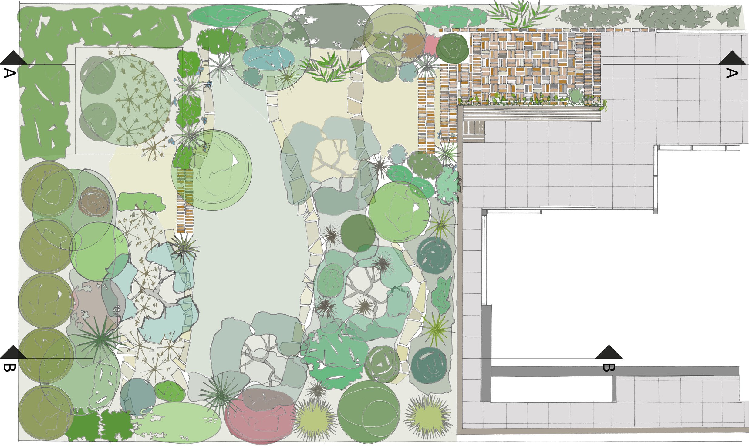 site plan illustrating the spatial layout and quality, the look and feel of the garden, its key components and finishes, uses and functions.